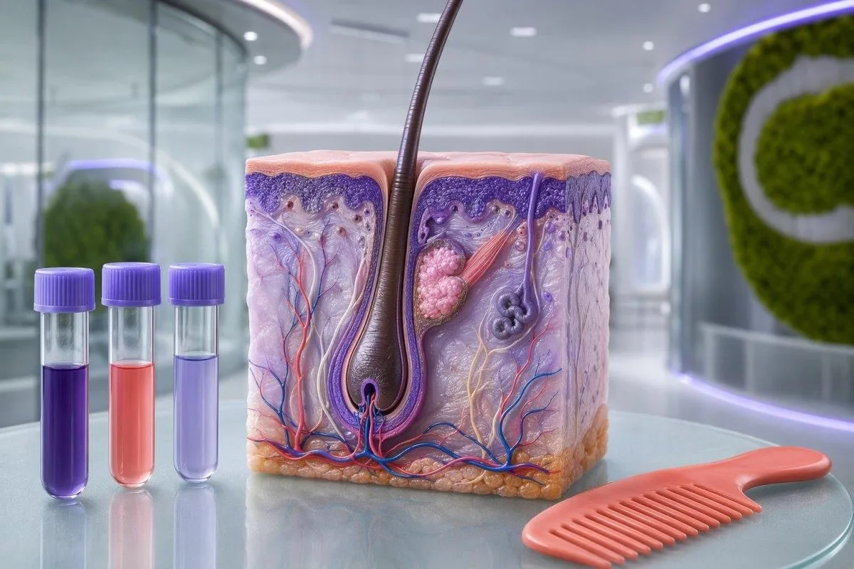 Аналізы крыві для выпадзення валасоў, паказаныя з анатоміяй валасянога фалікула і лабараторнымі прабіркамі з маркерамі